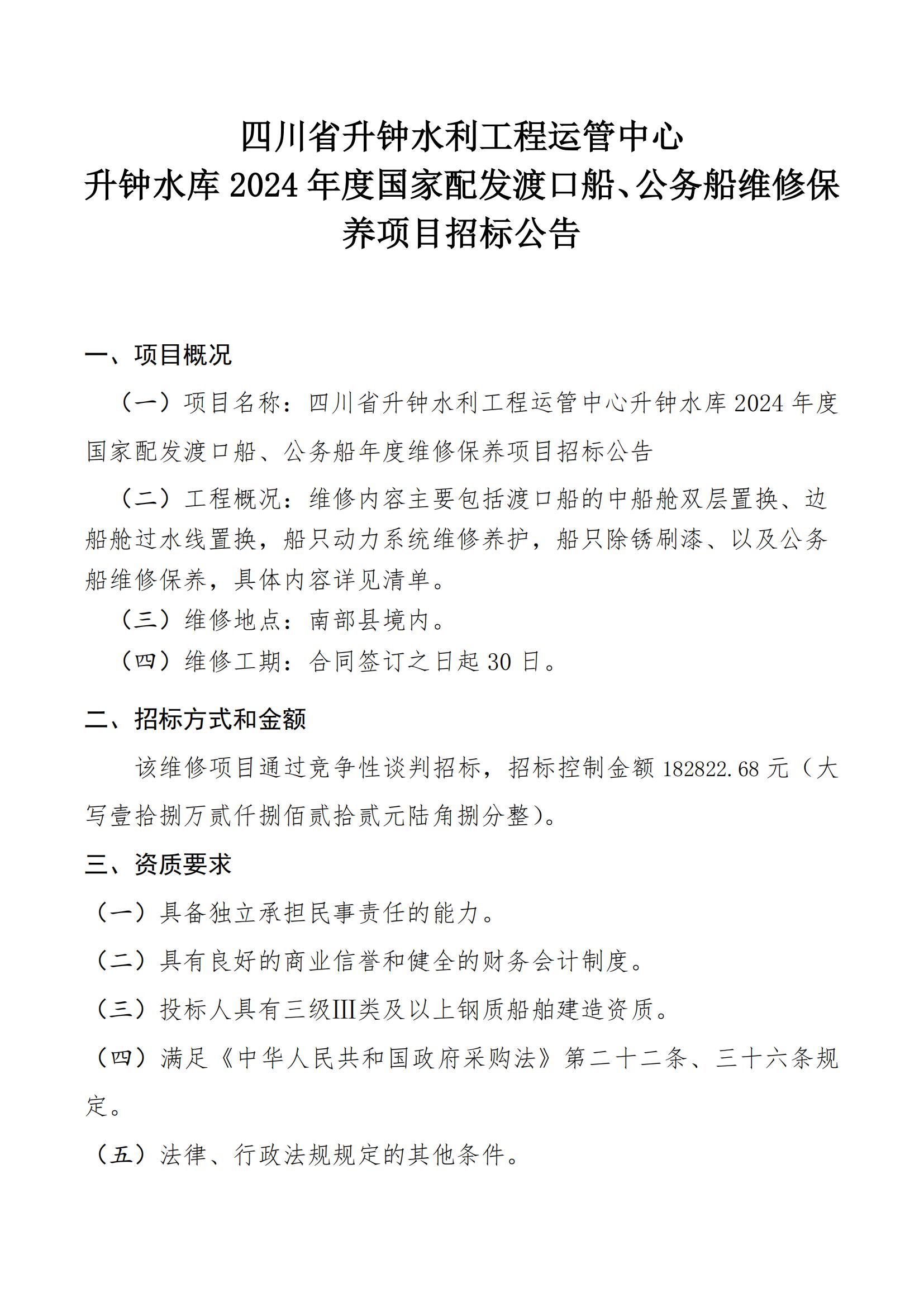升鐘水庫2024年度國家配發(fā)渡口船、公務(wù)船年度維修保養(yǎng)項目招標公告