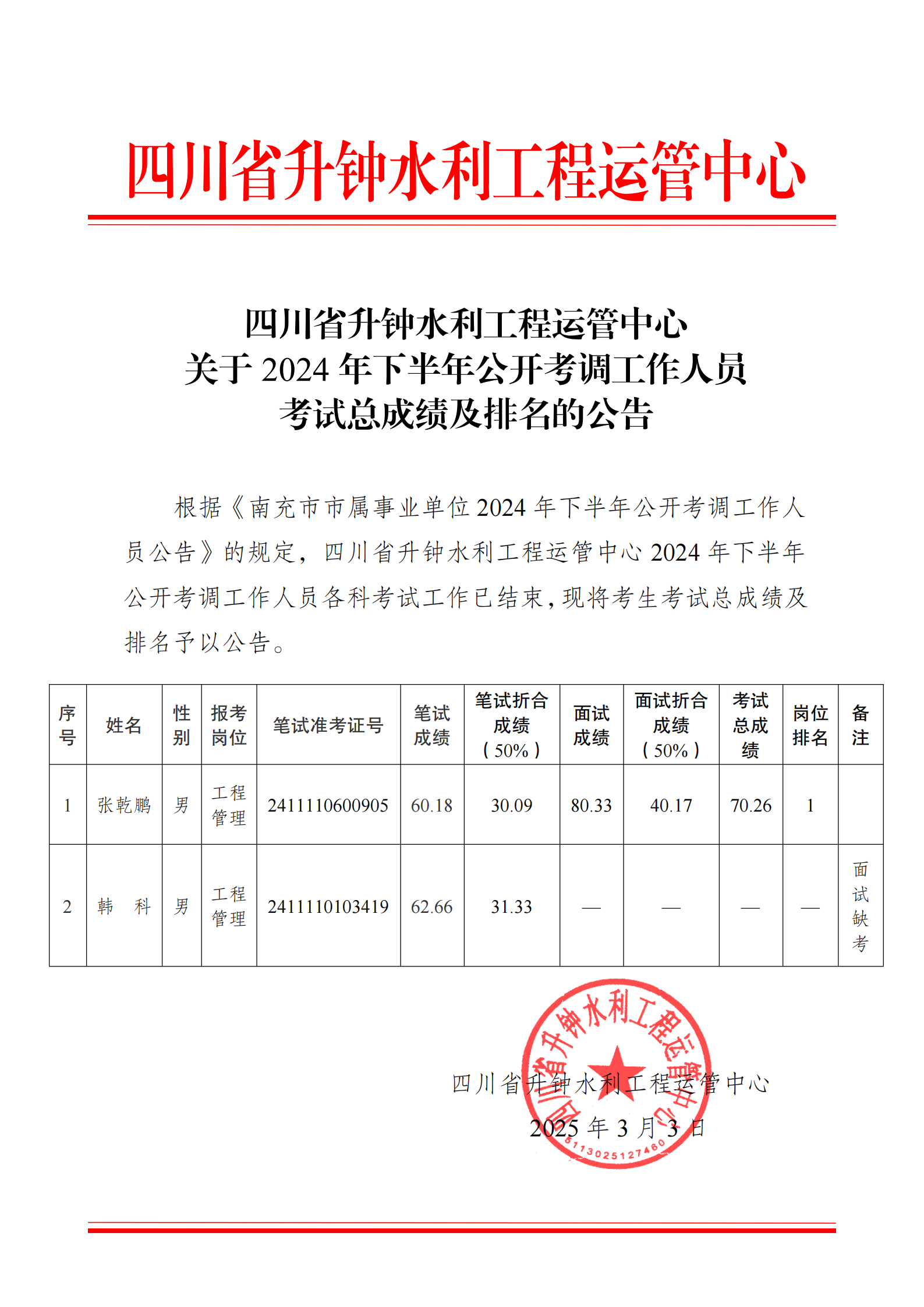 關(guān)于2024年下半年公開(kāi)考調(diào)工作人員考試總成績(jī)及排名的公告