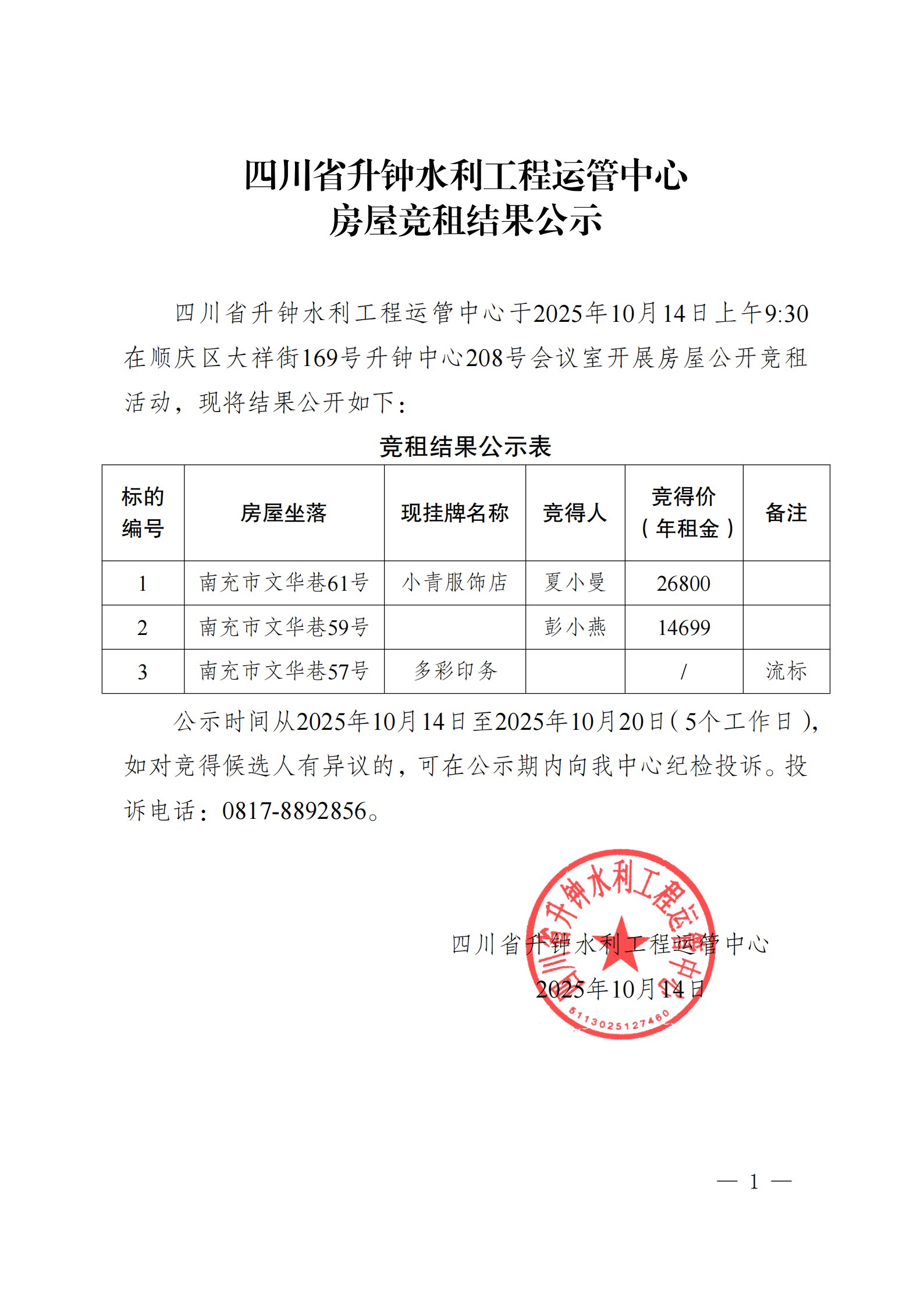 四川省升鐘水利工程運管中心房屋競租結(jié)果公示
