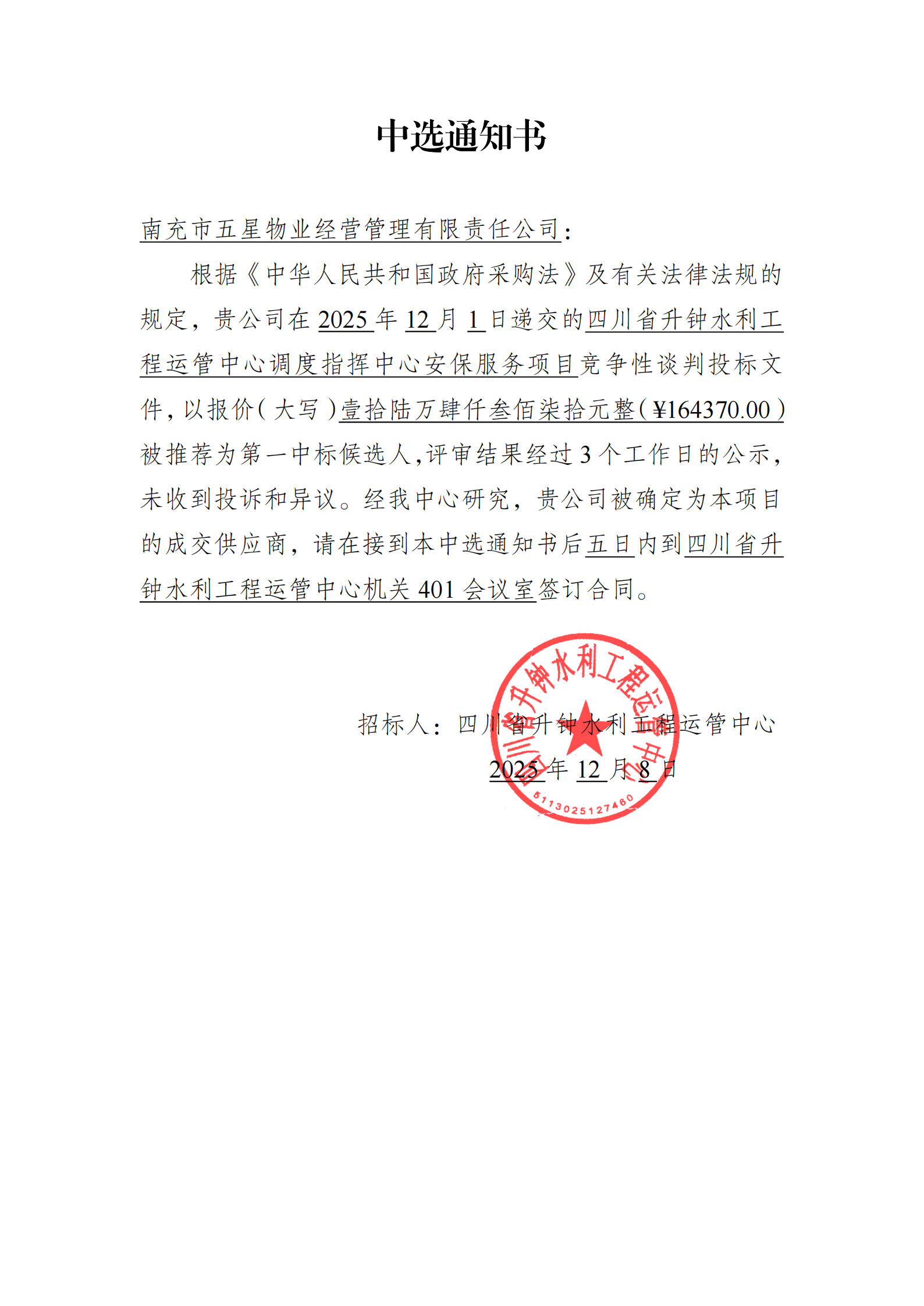 四川省升鐘水利工程運管中心房屋競租結果公示