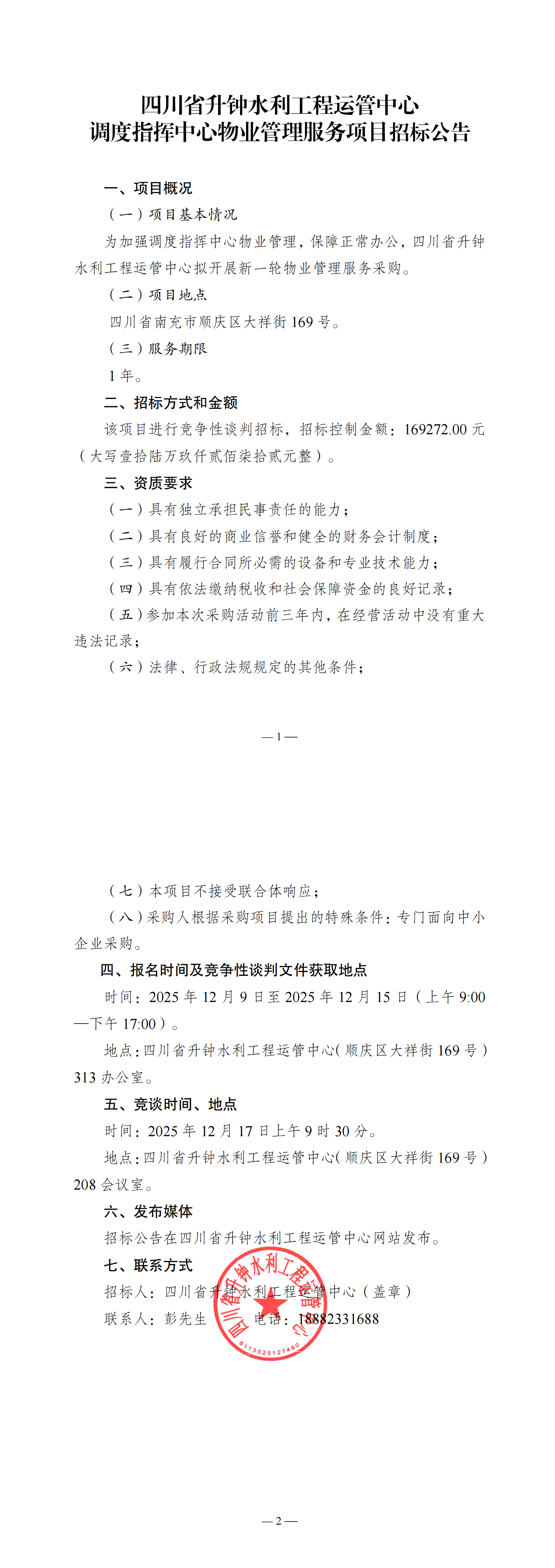 四川省升鐘水利工程運管中心調(diào)度指揮中心物業(yè)管理服務(wù)招標(biāo)公告
