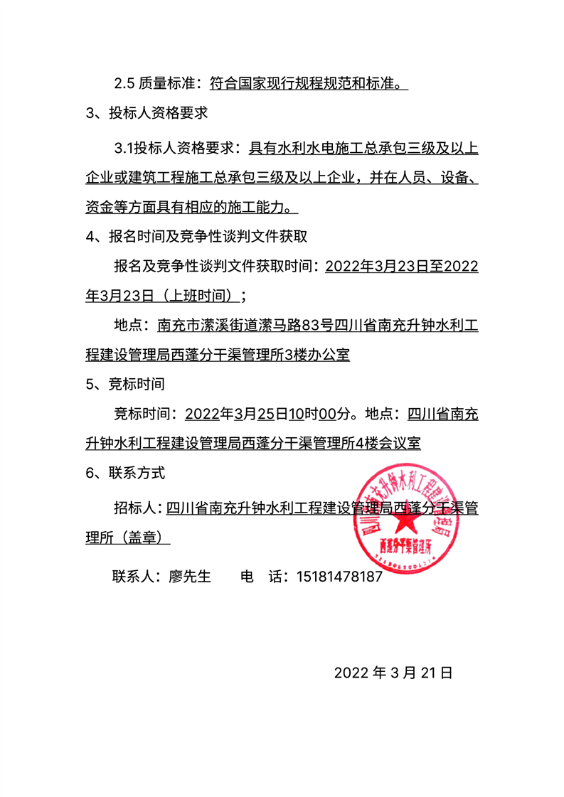 四川省南充升鐘水利工程建設(shè)管理局西蓬所2021年維修養(yǎng)護項目競爭性談判招標公告