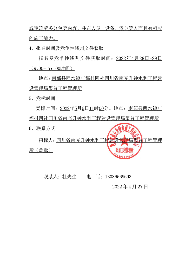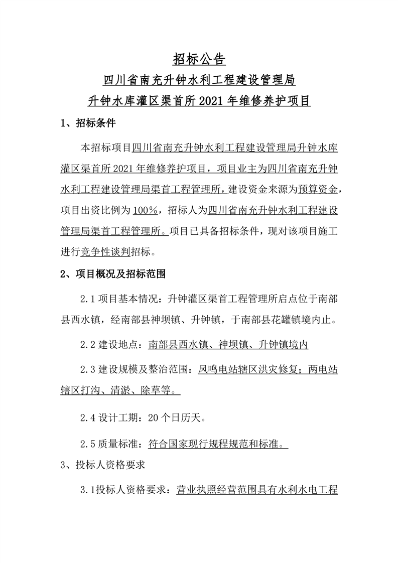 南充升鐘建管局渠首所2021年維修養(yǎng)護項目(招標公告)