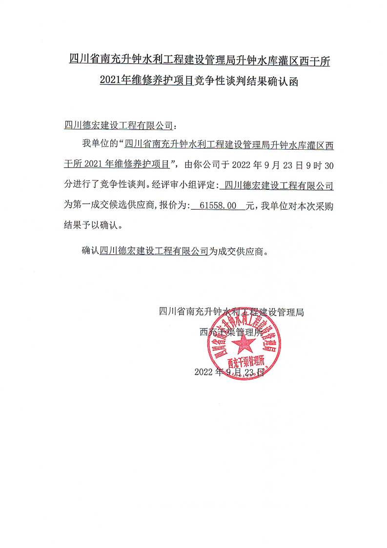 南充升鐘建管局西干所2021年維修養(yǎng)護項目競爭性談判結(jié)果確認函