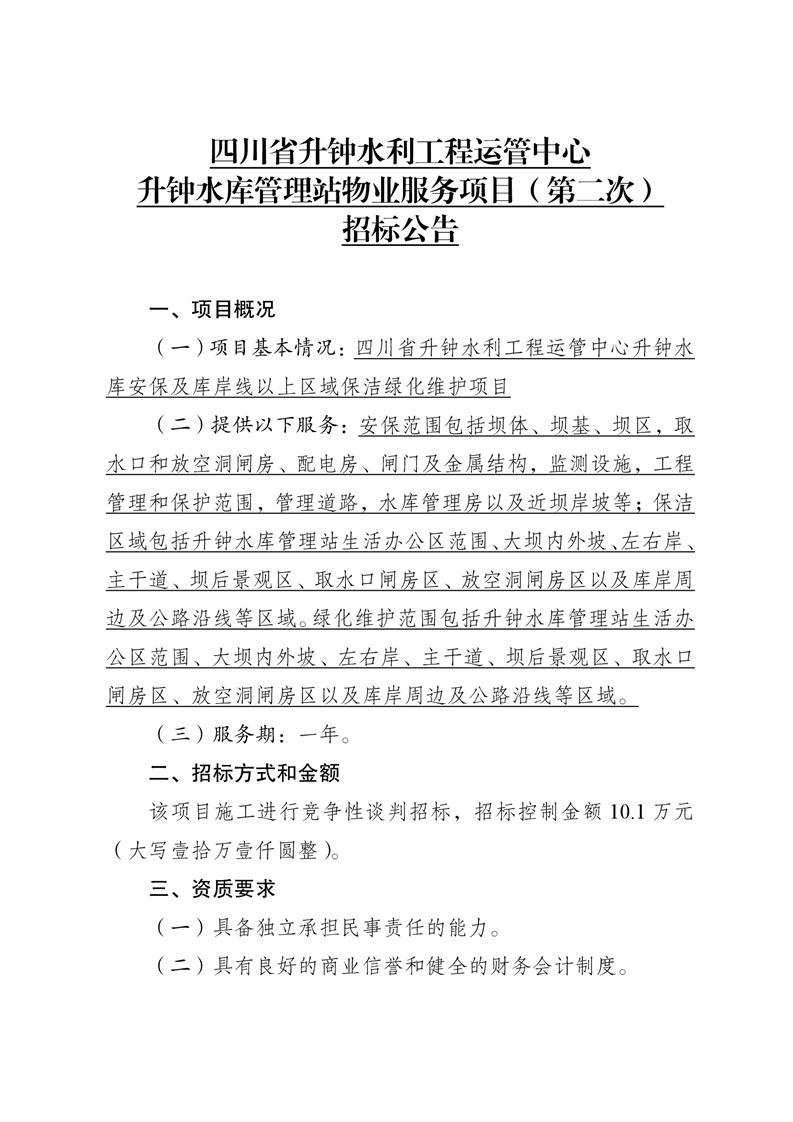 升鐘水庫水庫管理站物業(yè)服務項目(第二次)招標公告