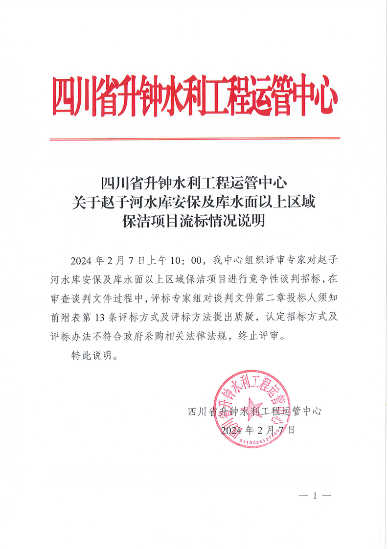 | 關(guān)于趙子河水庫(kù)安保及庫(kù)水面以上區(qū)域保潔項(xiàng)目流標(biāo)情況說(shuō)明 |
