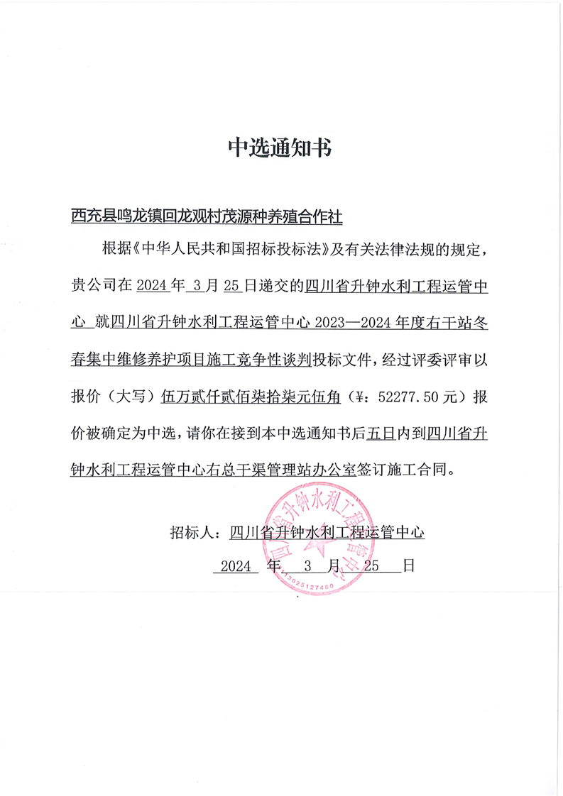 2023-2024年度西蓬站冬春集中維修養(yǎng)護(hù)項(xiàng)目競(jìng)爭(zhēng)性談判結(jié)果確認(rèn)函