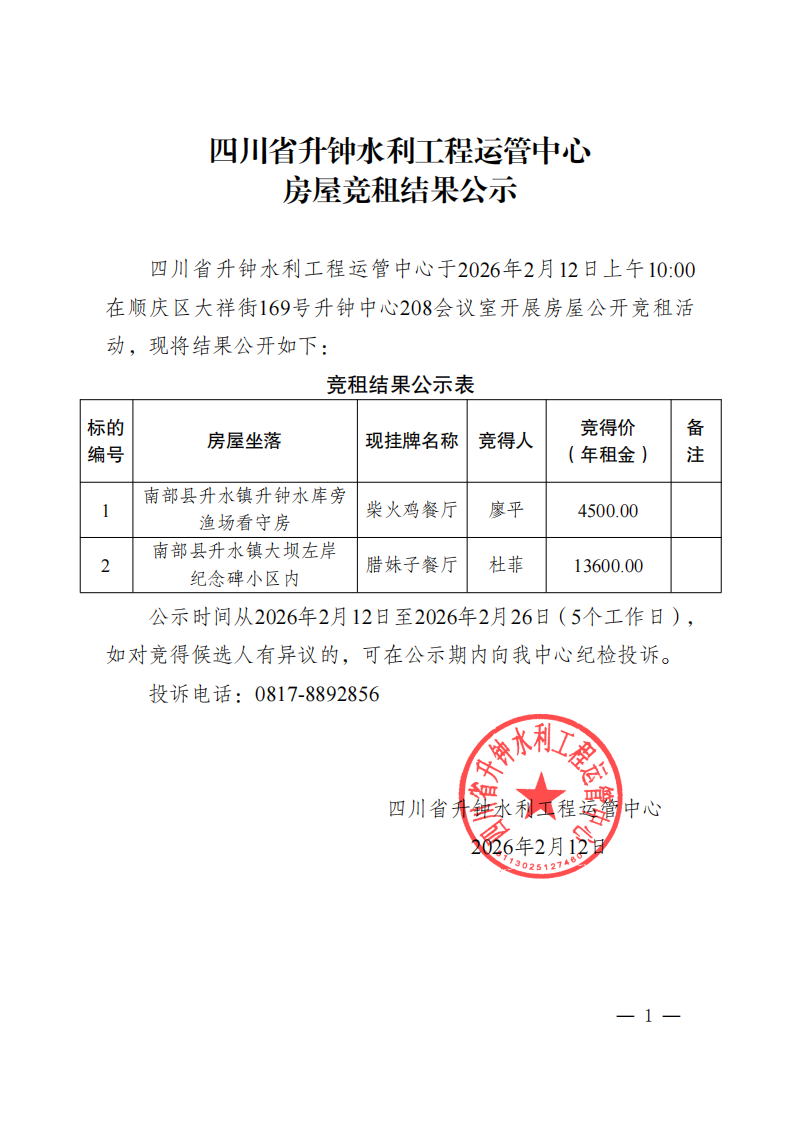 四川省升鐘水利工程運(yùn)管中心房屋競租結(jié)果公示