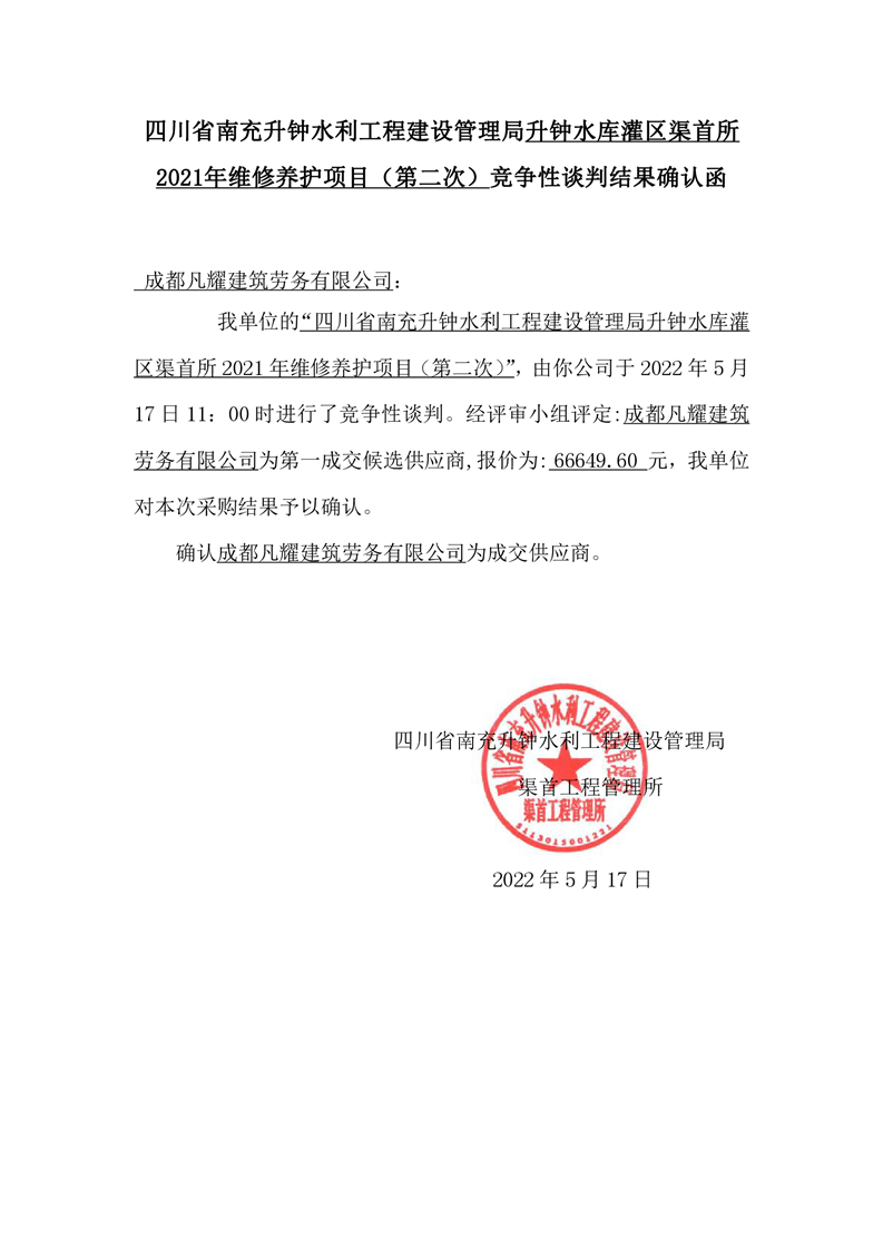 南充升鐘建管局渠首所2021年維修養(yǎng)護項目(第二次)競爭性談判結果確認函