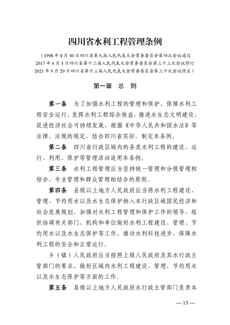 四川省水利工程管理?xiàng)l例(2021年9月29日四川省第十三屆人民代表大會(huì)常務(wù)委員會(huì)第三十次會(huì)議修正)