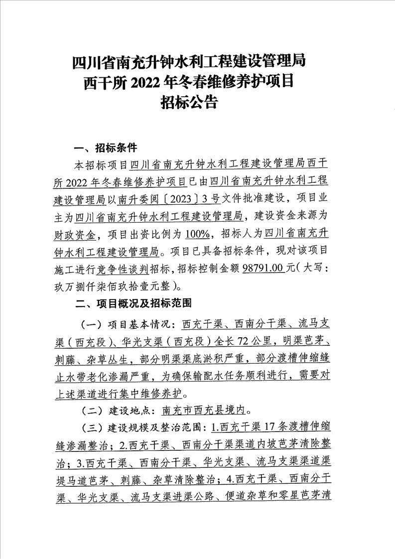 | 四川省南充升鐘水利工程建設(shè)管理局西干所2022年冬春維修養(yǎng)護(hù)項(xiàng)目招標(biāo)公告 |