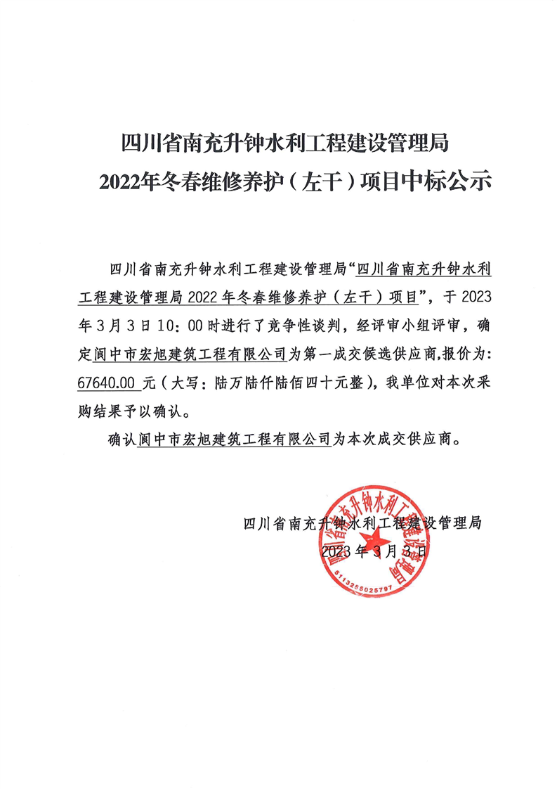 四川省南充升鐘水利工程建設管理局2022年冬春維修養(yǎng)護(左干)項目中標公示